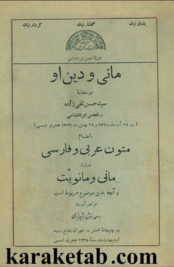 فلسفه مانی و دین او که در سال هزار و سیصد سی و پنج که توسط حسن تقی زاده نوشته شده است.که گردآورنده ی آن احمد افشار شیرازی است.انتشارات این کتاب انجمن ایرانشناسی می باشد.و در قطع وزیری به چاپ رسیده است.تعداد صفحات این کتاب هفتصد و دو صفحه می باشد.
